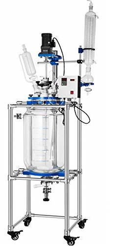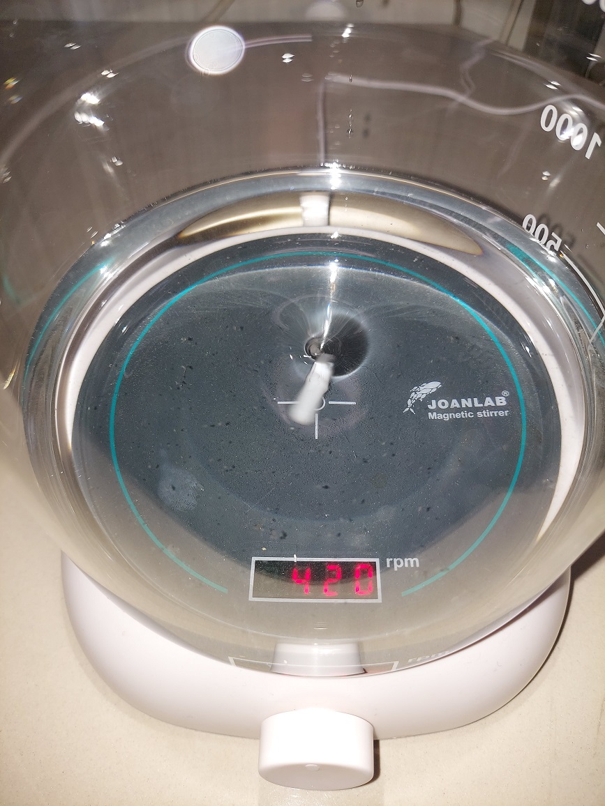 Desigur, vasul respectiv a fost pregatit pentru o ilustrare, pentru a putea observa frecventa de rotatie a magnetului si a lichidului (desi aceasta este valabila doar in imediata vecinatate a rotorului). In practica, prepararea se realizeaza in … dispozitive mai mari ca volum, precum reactorul de preparare din fotografia din dreapta, in care se realizeaza si concentrarea sub vid avansat, daca este necesar.